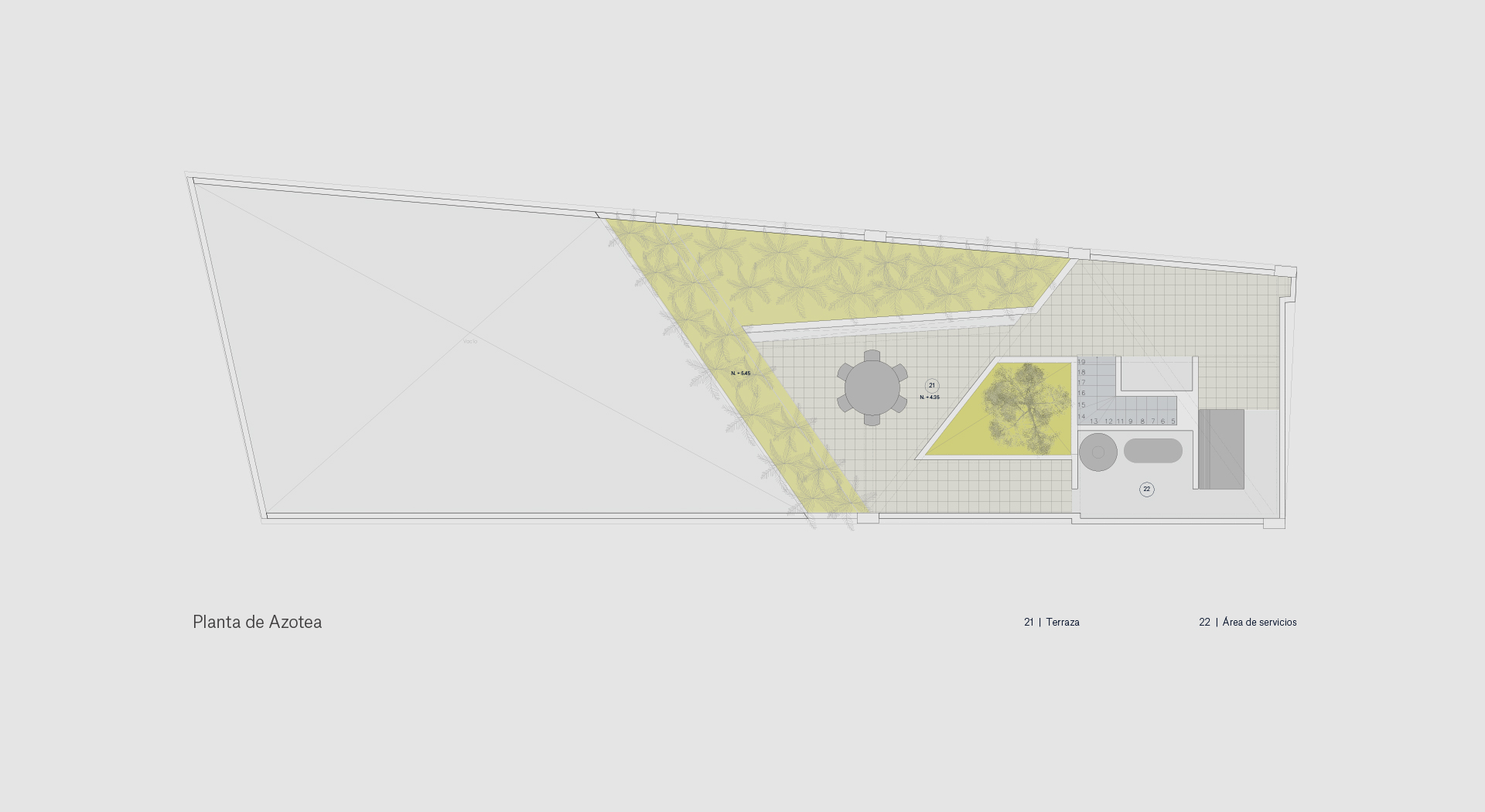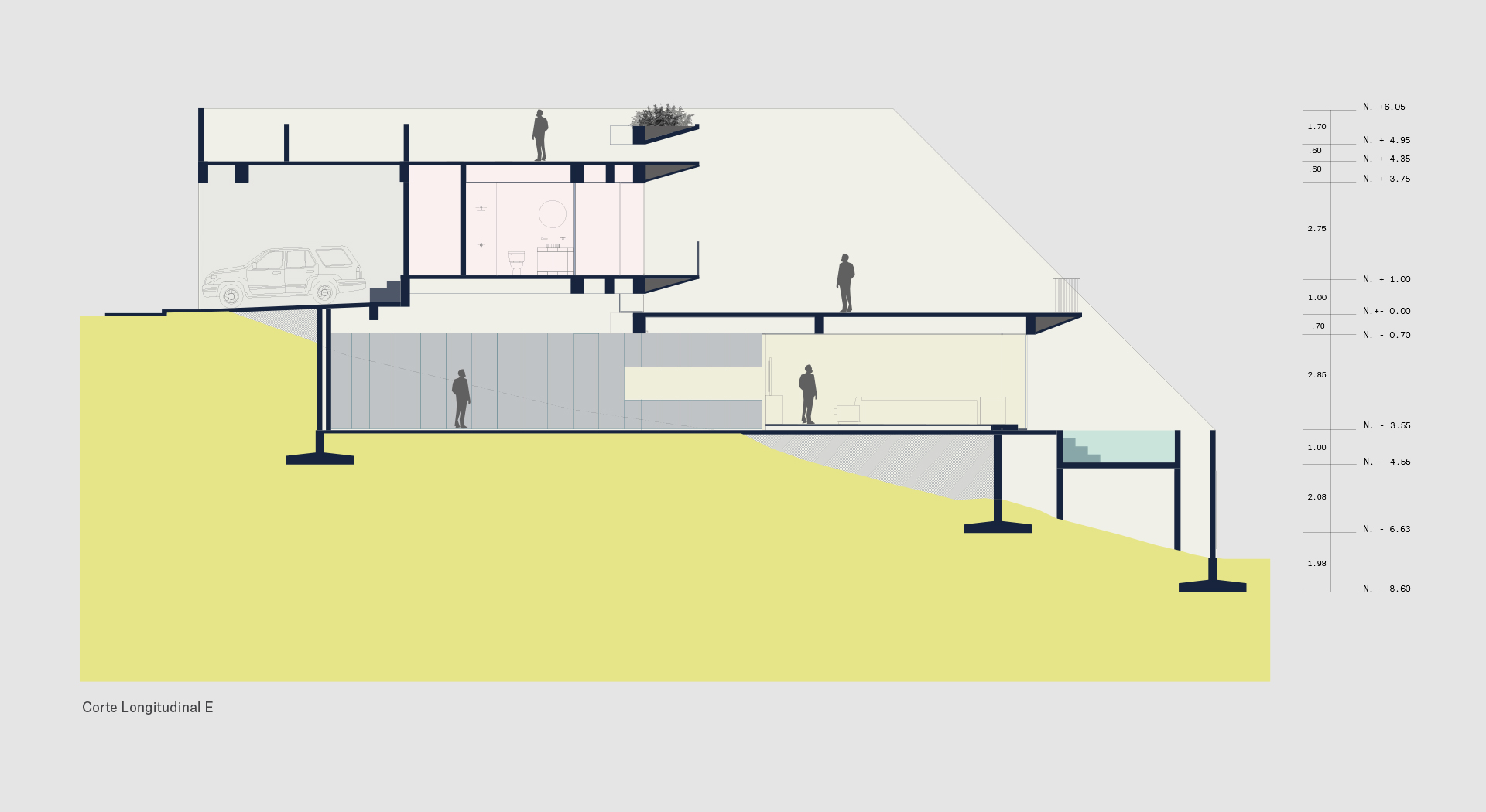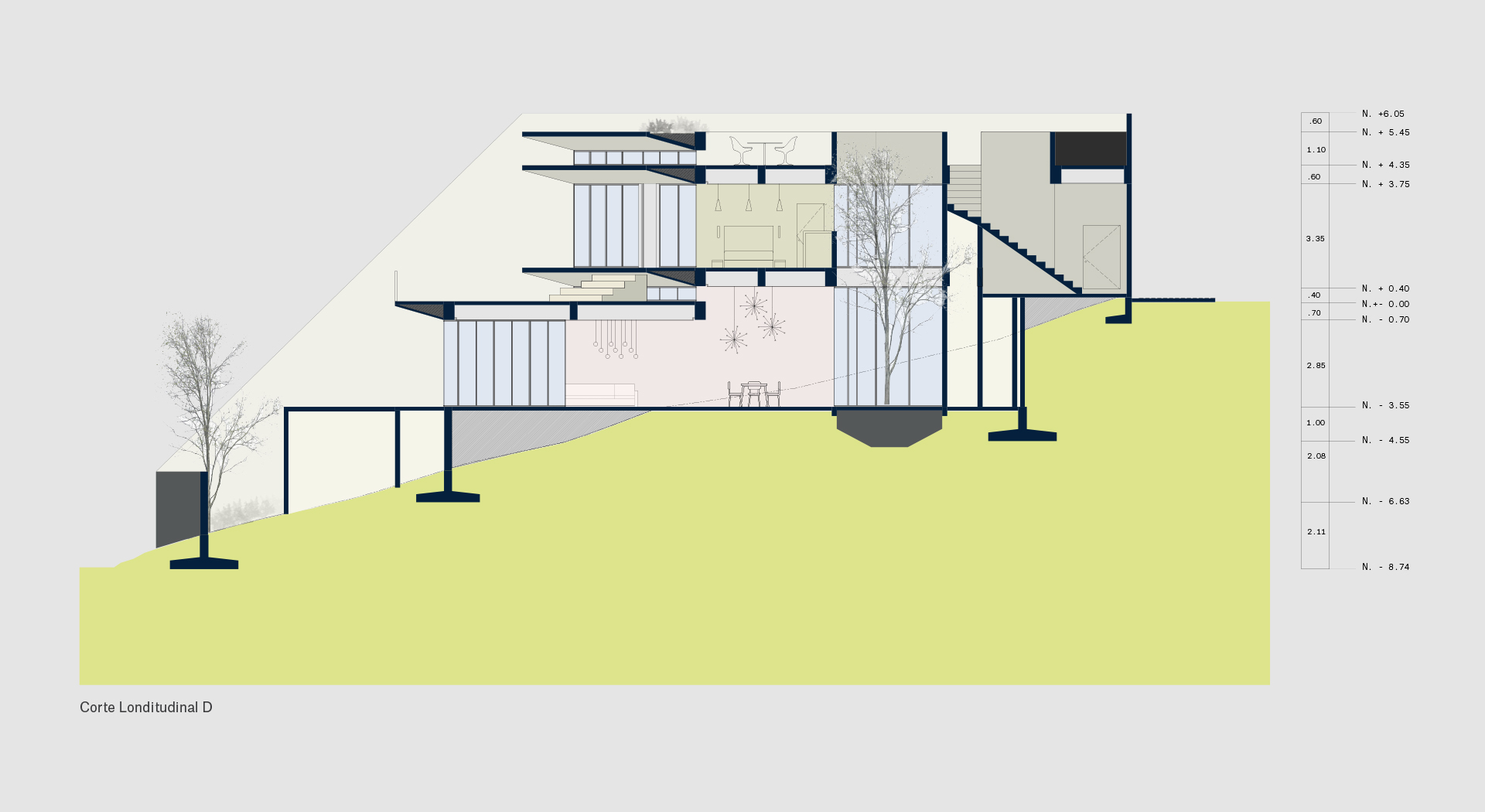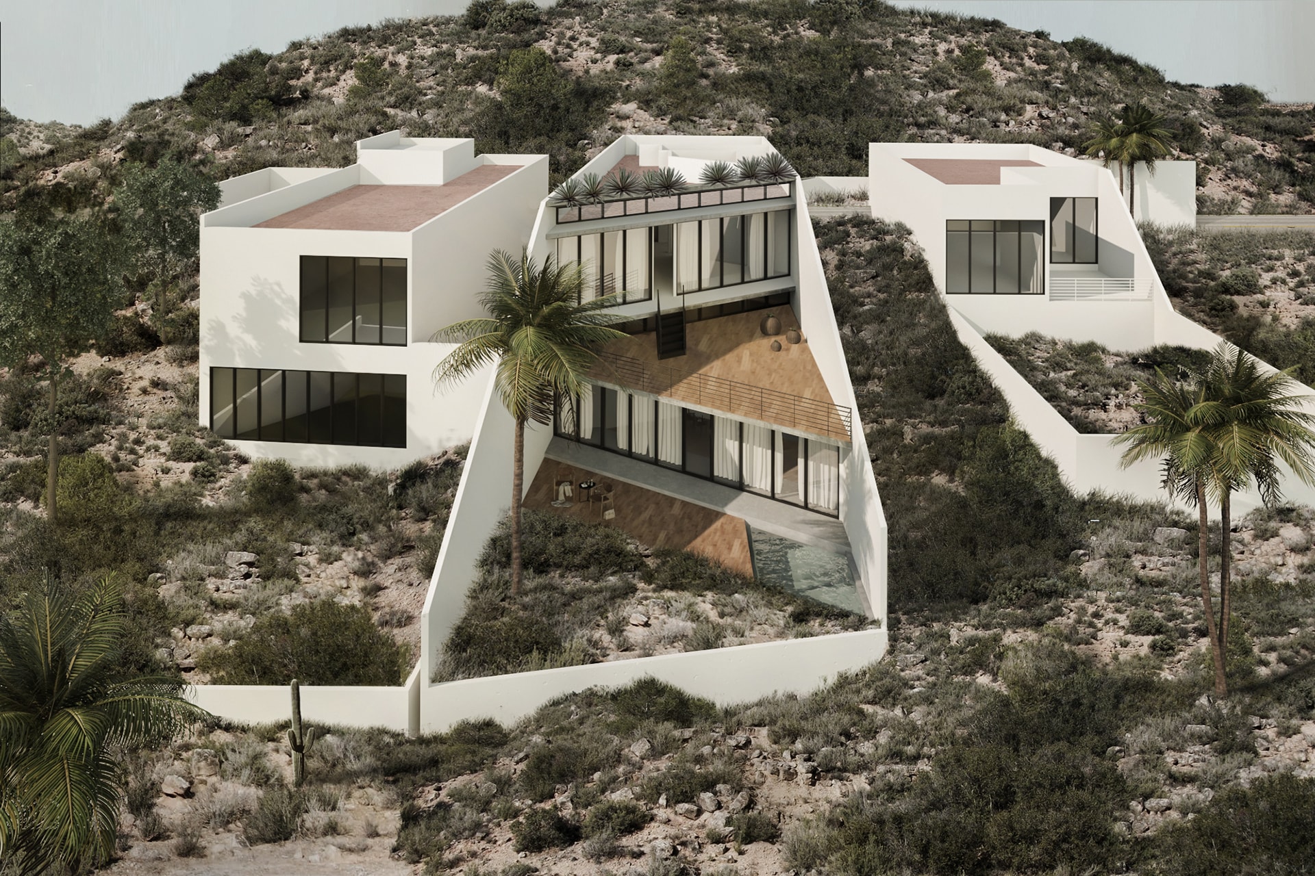 Proyectada sobre un terreno de gran pendiente y con una geometría irregular en forma cónica. La casa se desarrolla a través de terrazas que van descomponiendo los espacios. En el nivel de acceso se encuentra el área privada, las dos comparten una de las terrazas y en la planta baja el espacio público en planta abierta que se extiende hasta la terraza de ese nivel. Esta secuencia de terrazas y las inclinaciones de estas sirven para liberar visuales panorámicas hacia uno de los valles donde desde algunos puntos se puede ver el Pacífico.