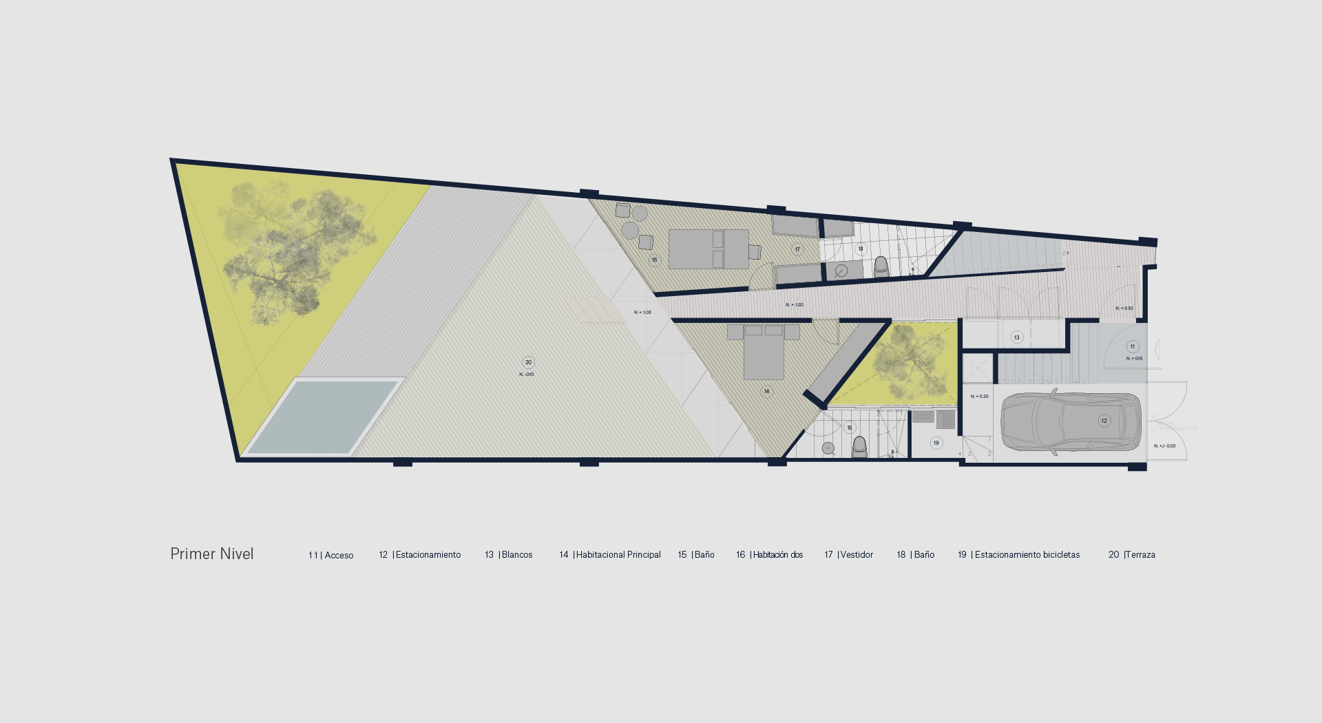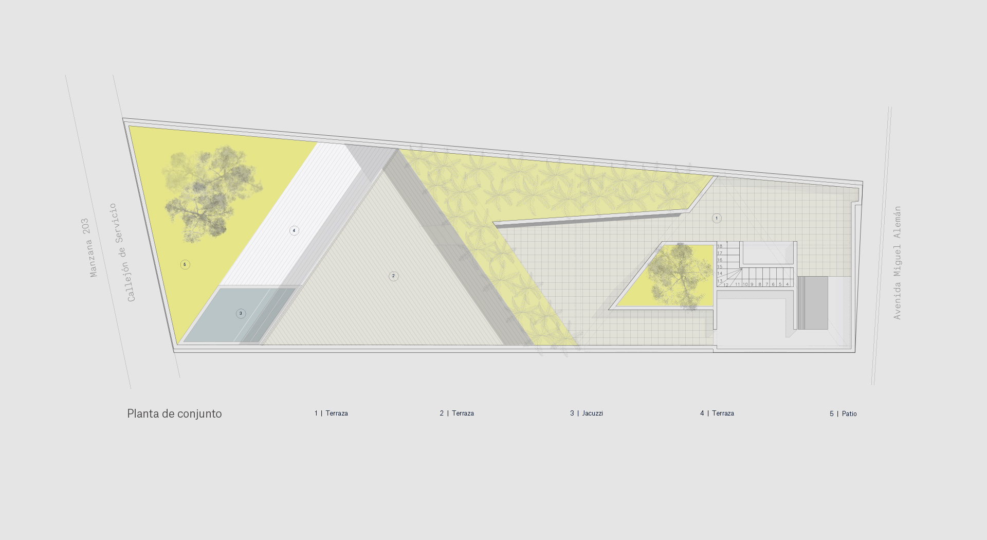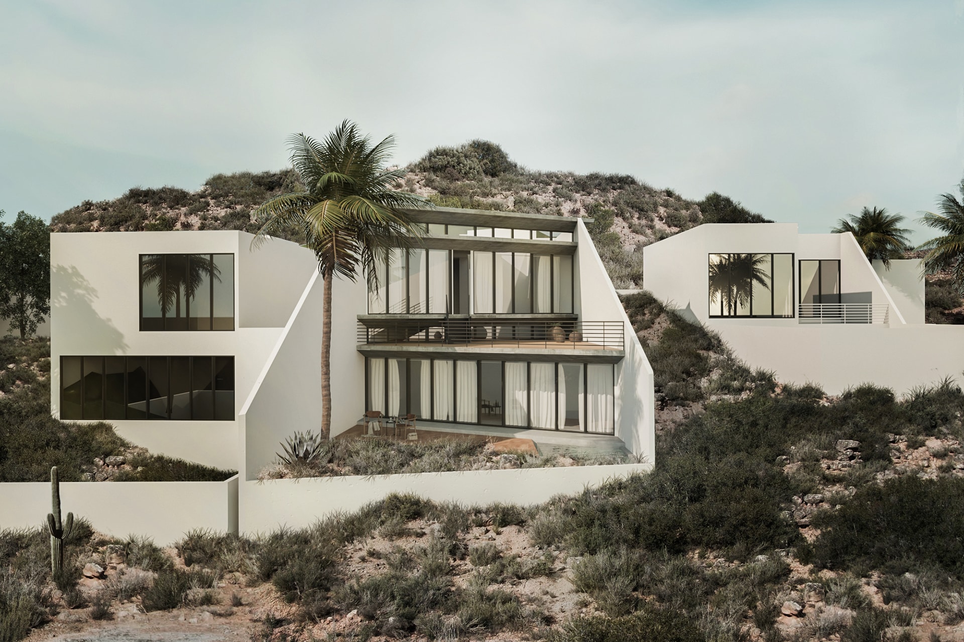 Proyectada sobre un terreno de gran pendiente y con una geometría irregular en forma cónica. La casa se desarrolla a través de terrazas que van descomponiendo los espacios. En el nivel de acceso se encuentra el área privada, las dos comparten una de las terrazas y en la planta baja el espacio público en planta abierta que se extiende hasta la terraza de ese nivel. Esta secuencia de terrazas y las inclinaciones de estas sirven para liberar visuales panorámicas hacia uno de los valles donde desde algunos puntos se puede ver el Pacífico.