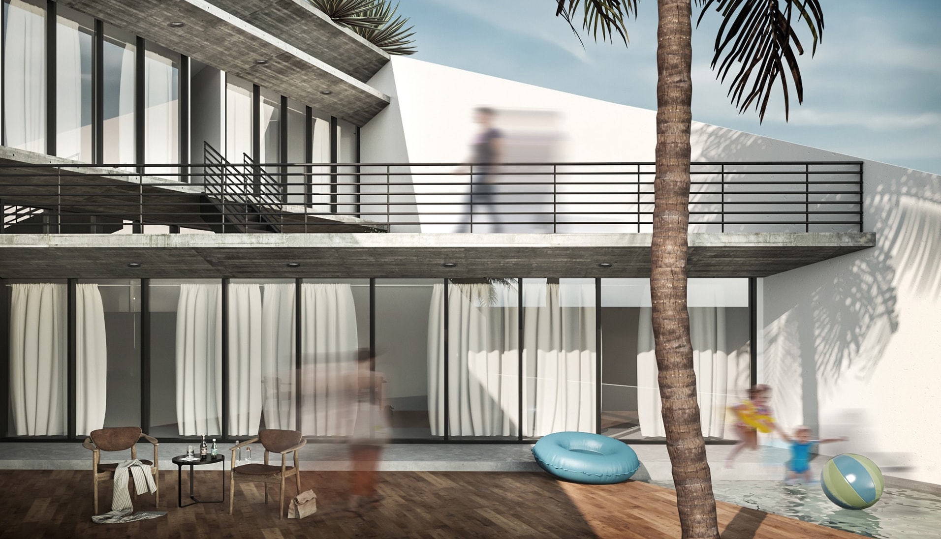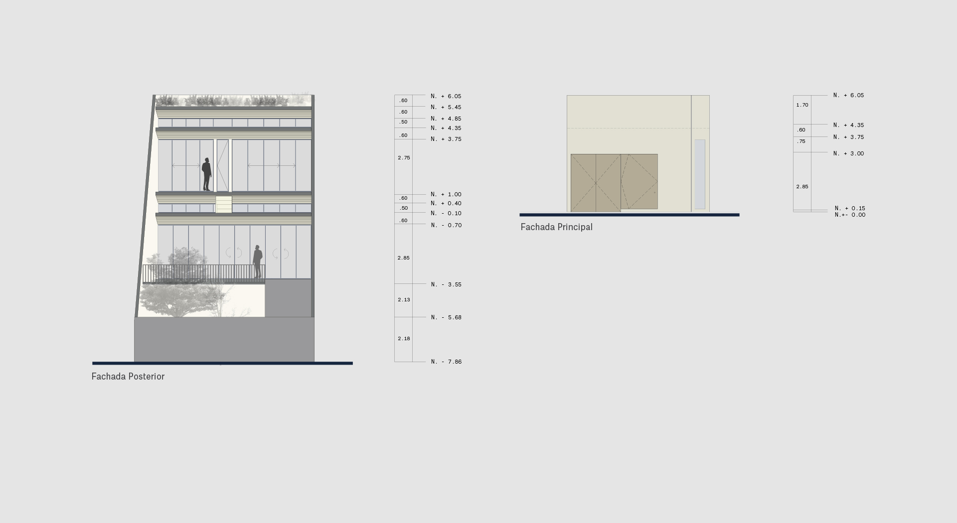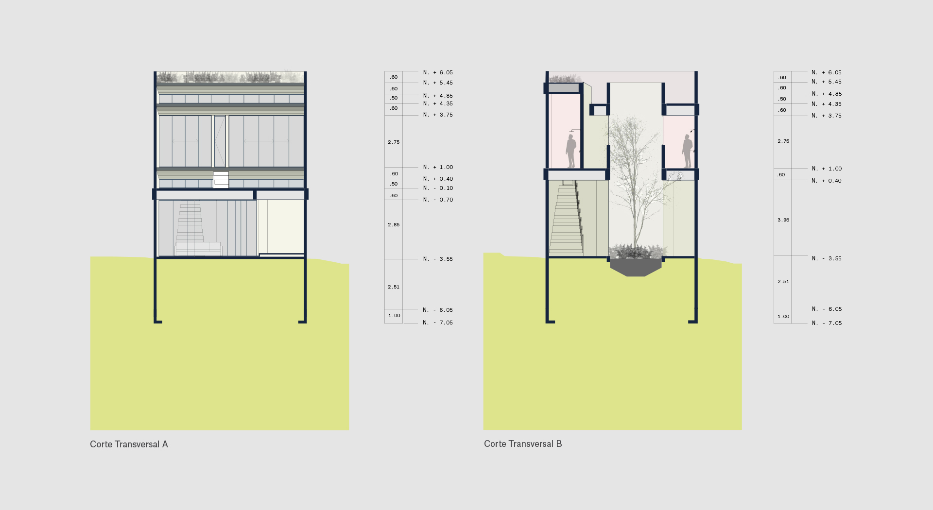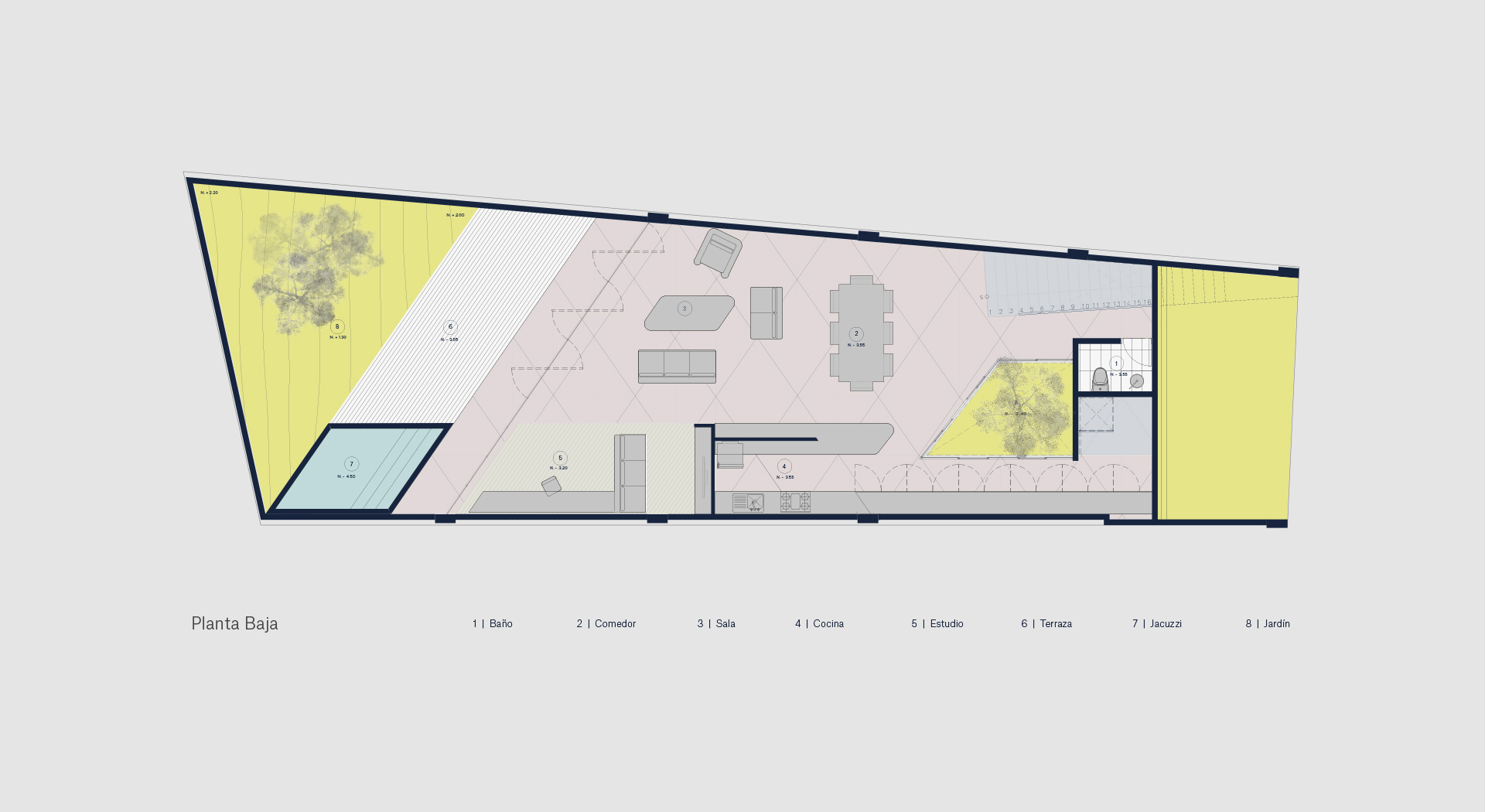 Proyectada sobre un terreno de gran pendiente y con una geometría irregular en forma cónica. La casa se desarrolla a través de terrazas que van descomponiendo los espacios. En el nivel de acceso se encuentra el área privada, las dos comparten una de las terrazas y en la planta baja el espacio público en planta abierta que se extiende hasta la terraza de ese nivel. Esta secuencia de terrazas y las inclinaciones de estas sirven para liberar visuales panorámicas hacia uno de los valles donde desde algunos puntos se puede ver el Pacífico.